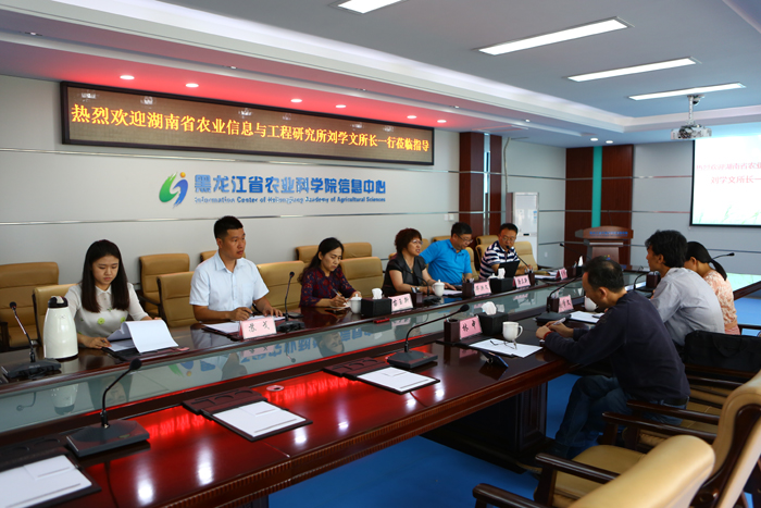 随后,双方在十楼会议室进行了友好的交流和座谈。毕洪文所长发表了热情洋溢的致辞,对刘学文所长一行的到访表示诚挚的欢迎。唐立新副主任通过多媒体的形式,回顾了信息中心的发展历程,介绍了信息中心近年来在新班子和新理念的引领下所取得的成果,并就期刊编辑、工程咨询、新闻宣传、网络服务等各学科的发展情况与刘学文所长一行进行了交流。特别针对湖南省农业信息与工程研究所正准备筹建的农业传媒工作,唐立新所长分享我中心的经验。刘学文所长也介绍了湖南省农业信息与工程研究所目前的发展情况。