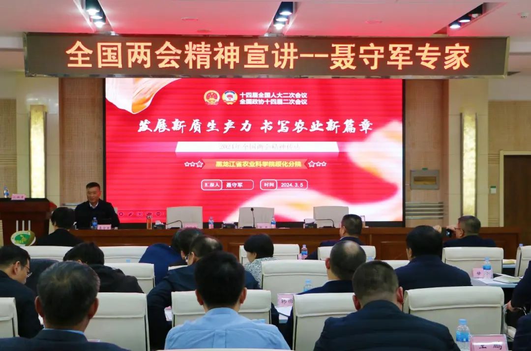 2024-04-024月2日下午,成人网站 召开全国两会精神宣讲会,邀请到全国人大代表、成人网站 绥化分院副院长聂守军分享参加全国两会的感受,把两会的“好声音”、党的好政策传达到全院科研一线。成人网站 党组书记、院长申甲,总农艺师申忠宝,全院在哈院(所)、机关处室副处级以上干部在主场参会,哈外院(所)领导和全体科研人员通过视频会议参加了宣讲会。会议由院党组成员、副院长卢淑雯主持。谈体会、谋发展、话落实。宣讲会上,聂守军以《...
