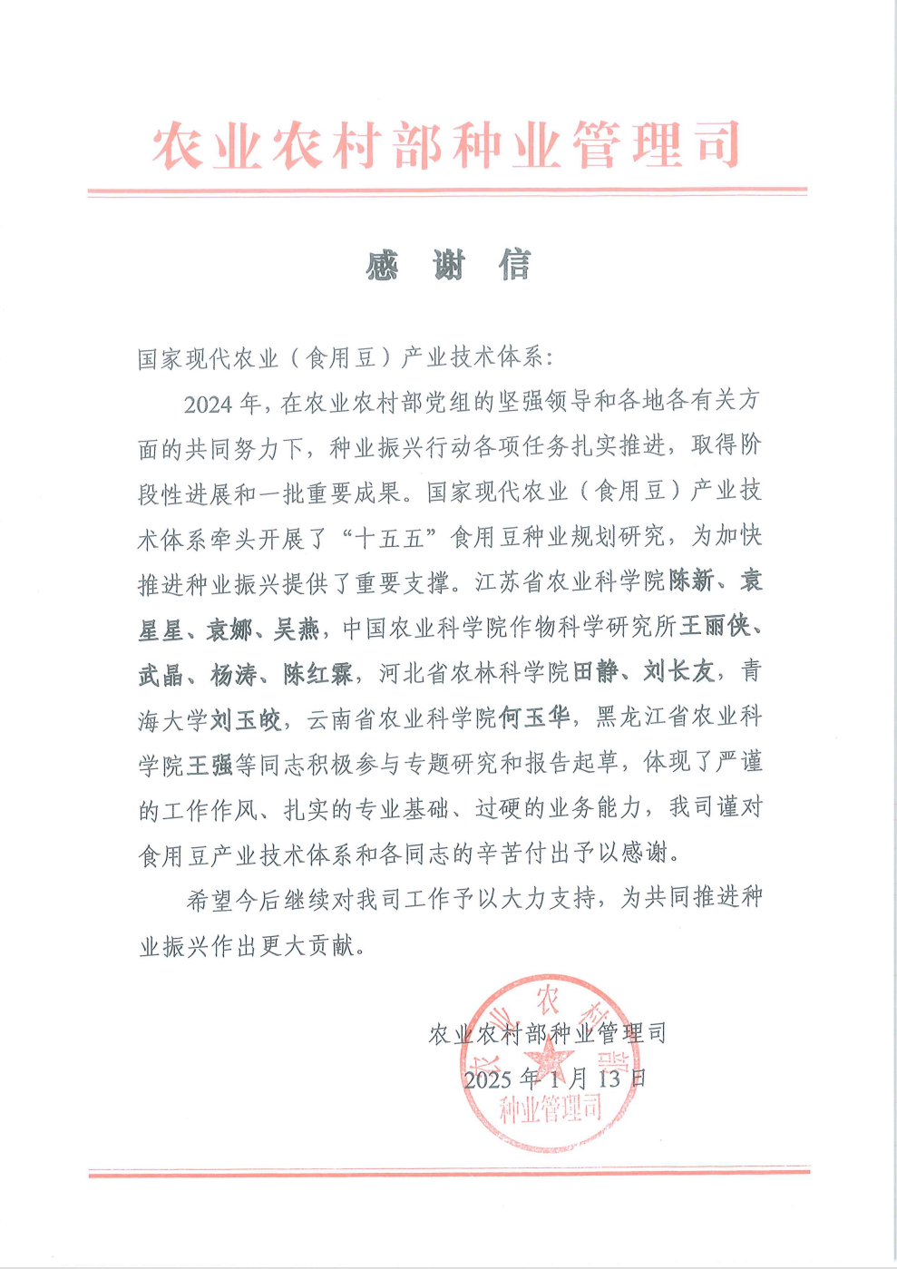 1月13日,农业农村部种业管理司向国家现代农业食用豆产业技术体系岗位科学家、成人网站 作物资源研究所王强团队发来感谢信。信中指出,国家现代农业(食用豆)产业技术体系牵头开展了“十五五”食用豆种业规划研究,为加快推进种业振兴提供了重要支撑。成人网站 王强等同志积极参与专题研究和报告起草,体现了严谨的工作作风、扎实的专业基础、过硬的业务能力,我司谨对食用豆产业技术体系和各同志的辛苦付出予以感谢。...